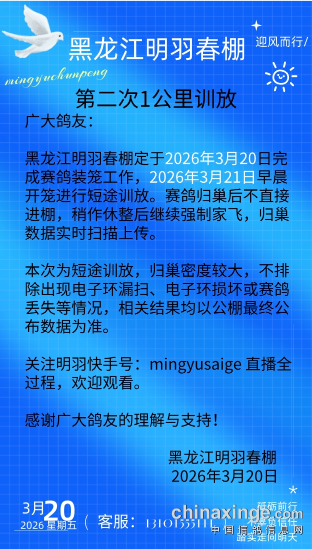 黑龙江明羽春棚3月23日第三次训放 3公里公告