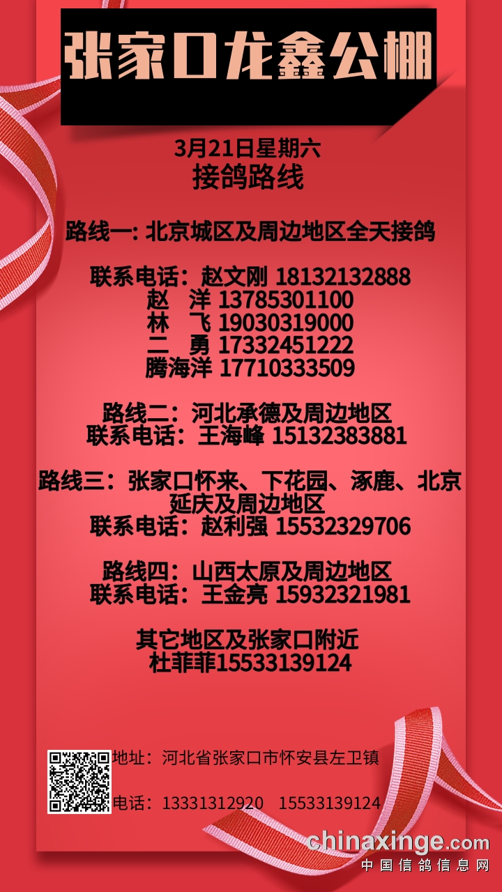 张家口龙鑫公棚3月21日接鸽路线
