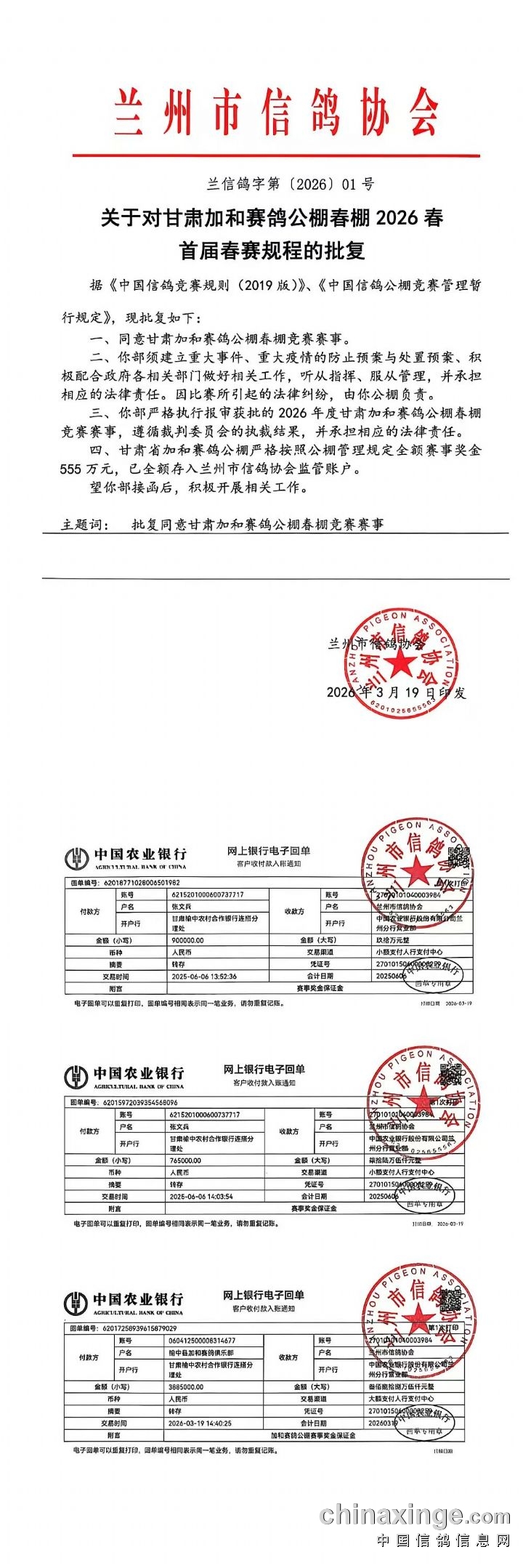 关于对甘肃加和赛鸽公棚春棚2026春首届春赛规程的批复通知