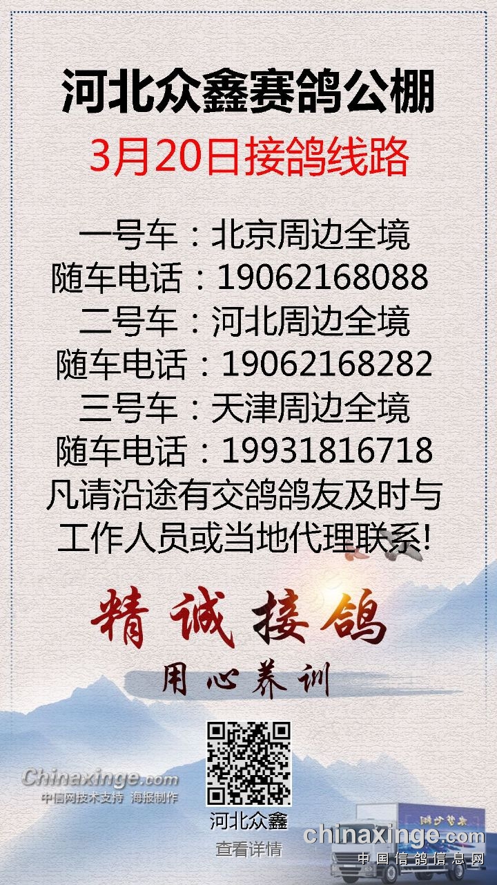 河北众鑫赛鸽公棚3月20日接鸽线路