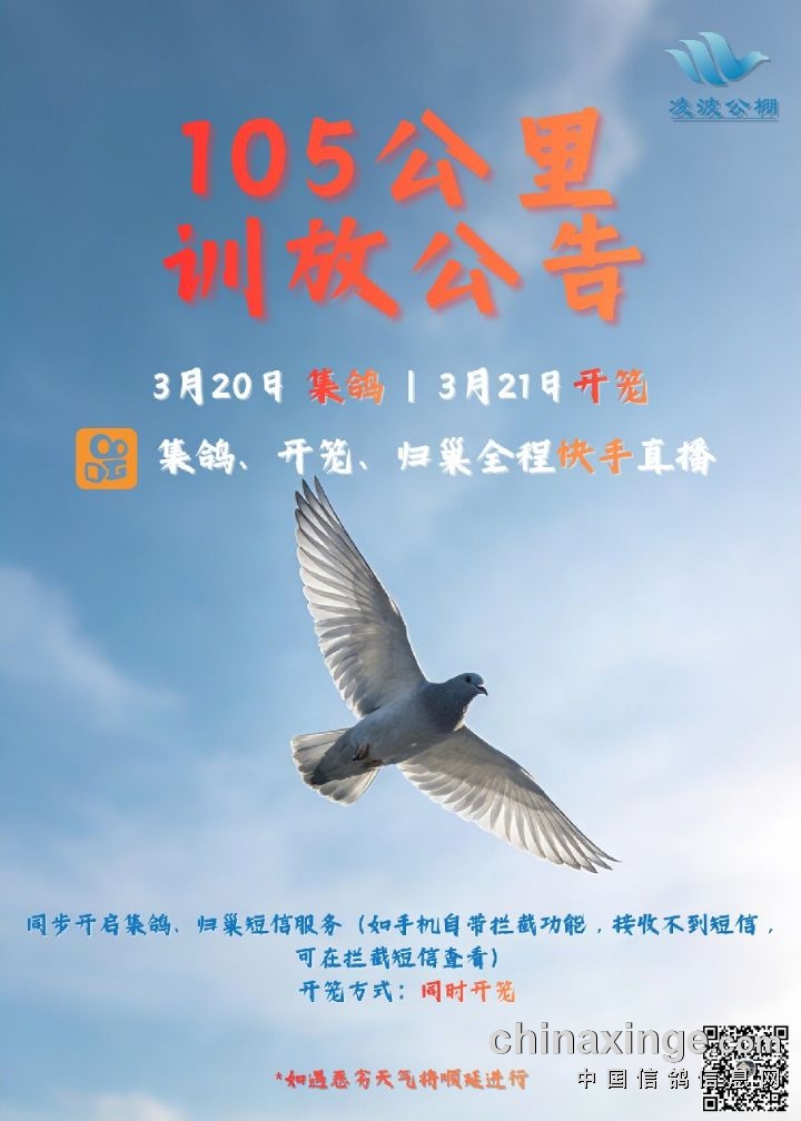 河北凌波公棚定于3月20日集鸽,21日开笼。本次收费站训放将进行人工逐羽集鸽扫描,由沧州市信鸽协会委派裁判,负责监督此次现场集鸽、装笼、开笼及归巢,届时快手平台将同步直播。