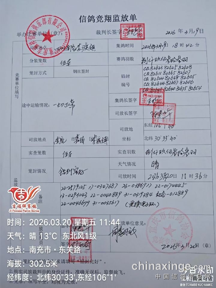 重庆吉福祥公棚第五届40空距于3月20日上午11:36分在四川省南充市嘉陵区-经度/纬度:106.1.40/30.33.40开笼放出,实际空距41空距,鸽群走势良好,敬请关注中鸽网、安捷网扫描直播成绩和手机短信(短信有一定错发漏发率,实际成绩以网站直播数据公布为准),预祝各位取得好成绩!