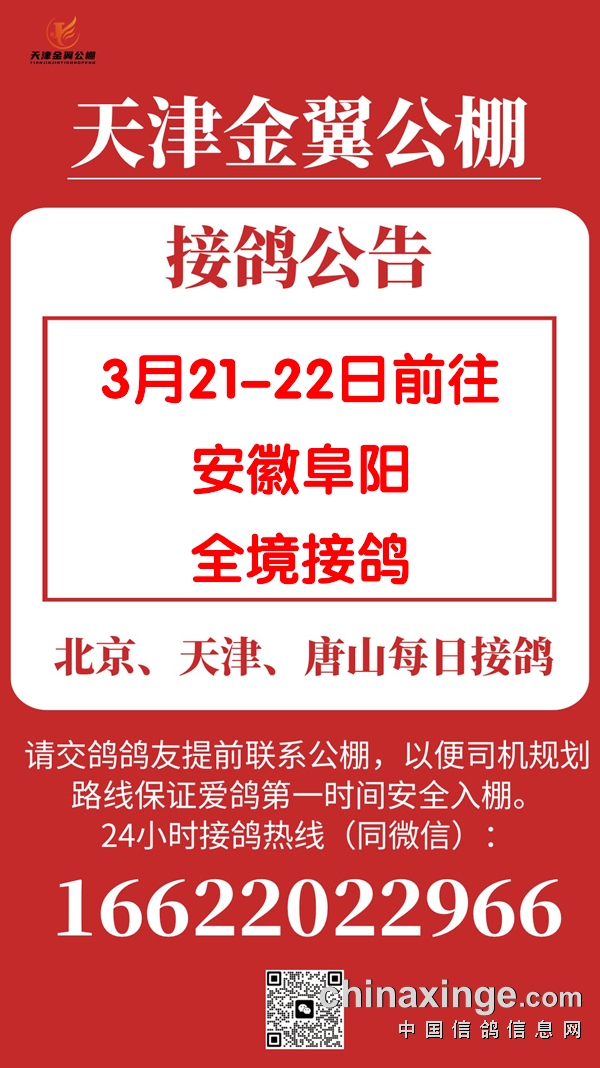 天津金翼公棚3月21-22日安徽阜阳全境接鸽