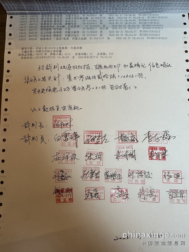 北国之春(春棚): 第一关热身赛归巢数据(按会员)(不排除游棚漏扫、电子环损坏)