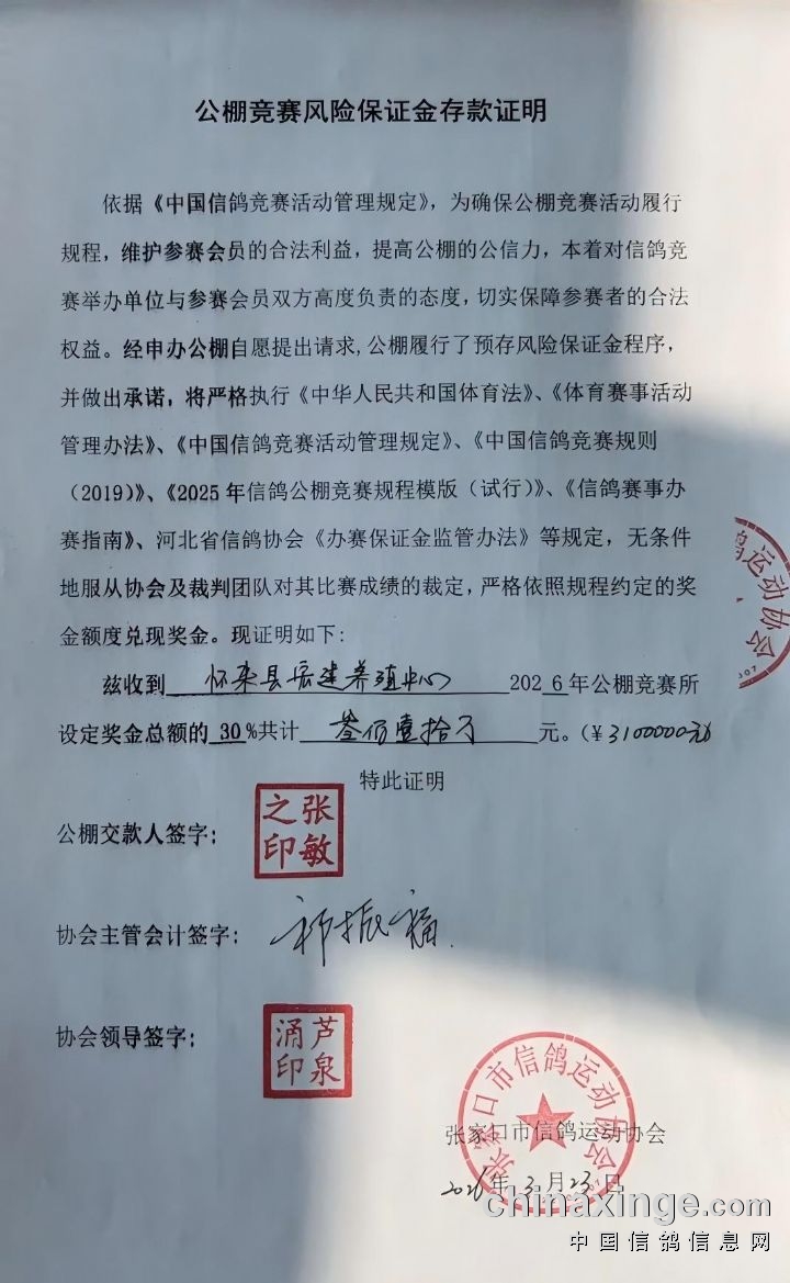 河北宏建赛鸽公棚2026秋季竞赛风险保证金已存入第三方监管账户