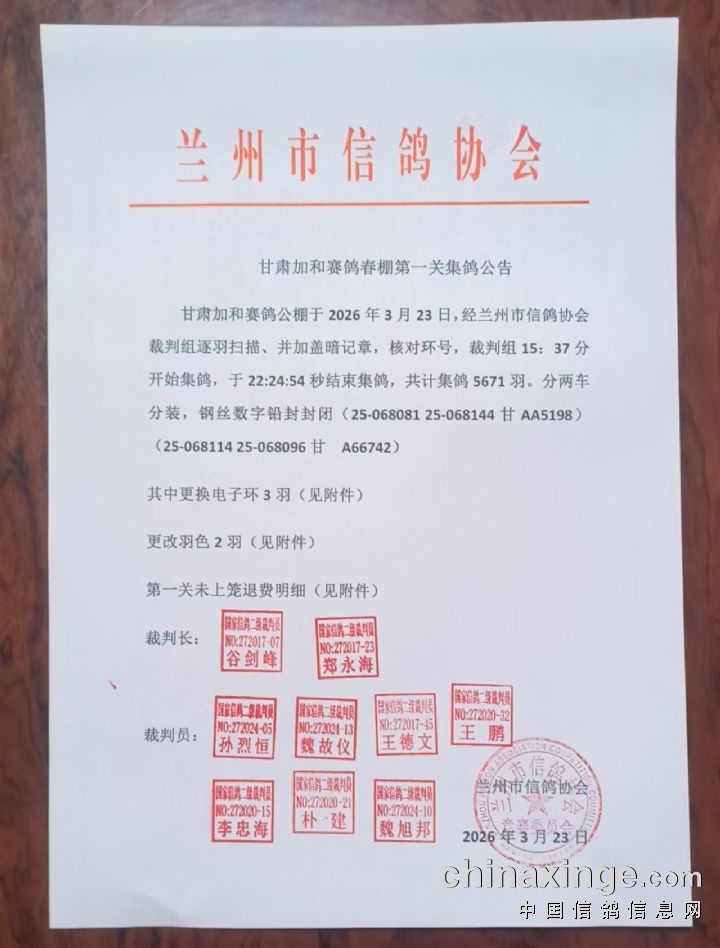 甘肃加和赛鸽公棚于2026年3月23日,经兰州市信鸽协会裁判组逐羽扫描、并加盖暗记章,核对环号,裁判组15:37分开始集鸽,于22:24:54秒结束集鸽,共计集鸽5671羽。分两车分装,钢丝数字铅封封闭(25-068081 25-068144 甘AA5198)(25-068114 25-068096 甘 A66742)