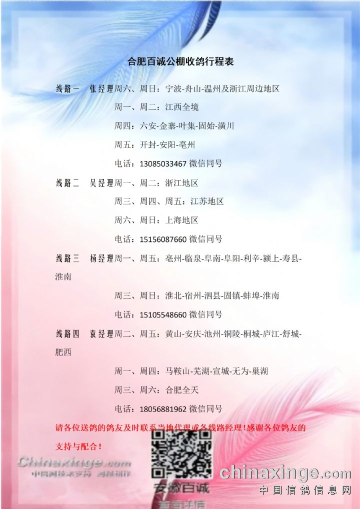 安徽百诚赛鸽中心:一周接鸽行程安排(3月23日-3月29日)