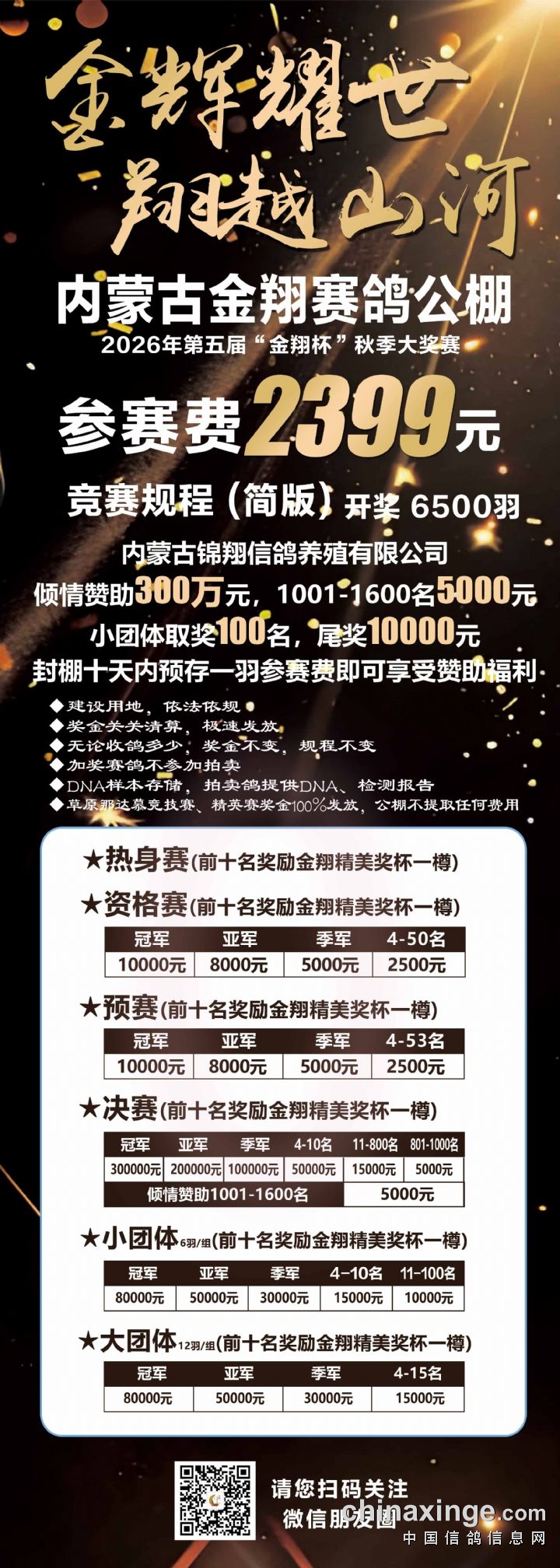 金秋竞翔,逐梦云端。感谢广大鸽友一路相伴与厚爱,金翔秋棚即日起正式开启2026年会员预订通道。