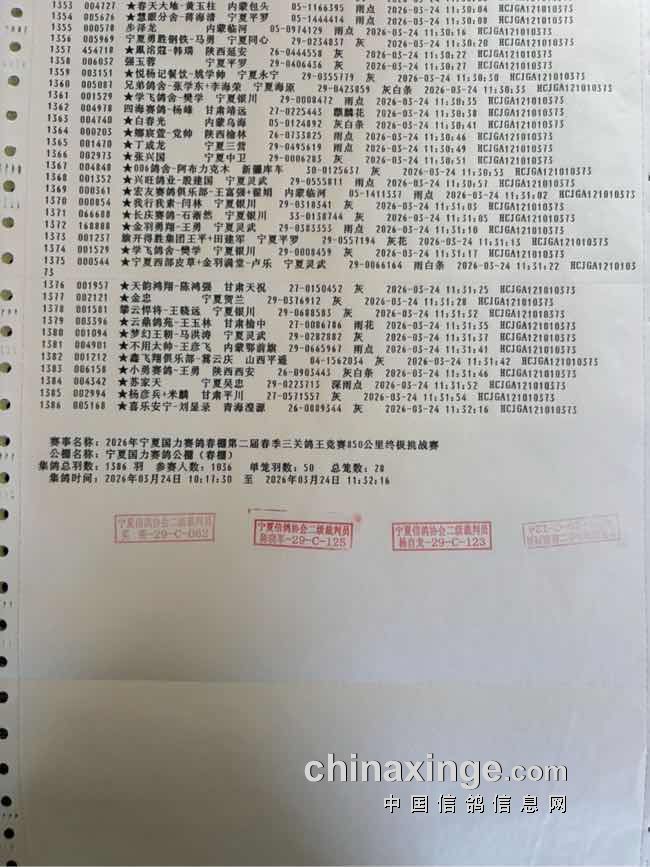 宁夏国力(春):850公里挑战赛集鸽明细(按顺序)