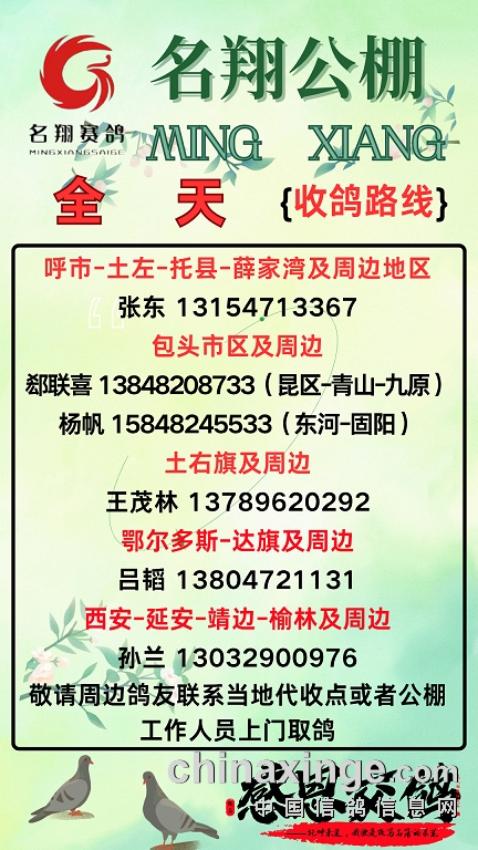 名翔公棚全天接鸽路线(包头市三区、土右、呼市、鄂尔多斯、陕西及周边地区)