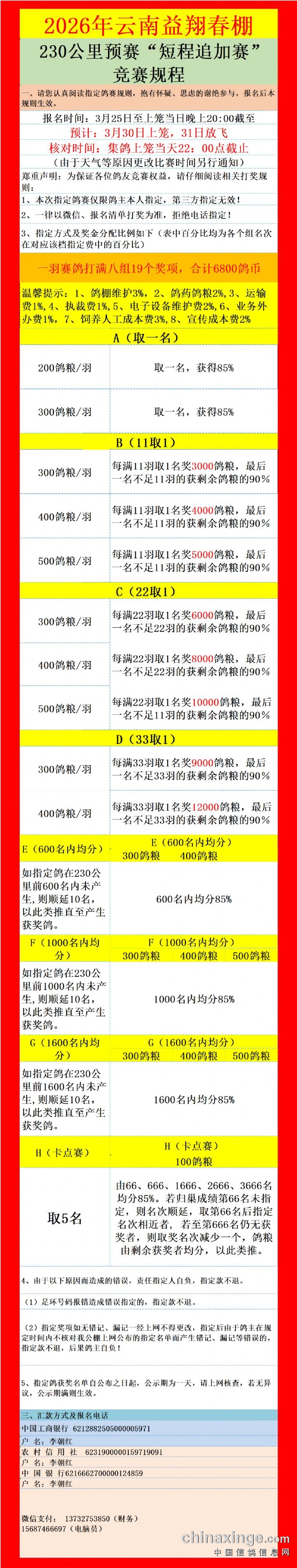 云南益翔春棚(第七届)230公里预赛“短程追加赛”相关报名清单