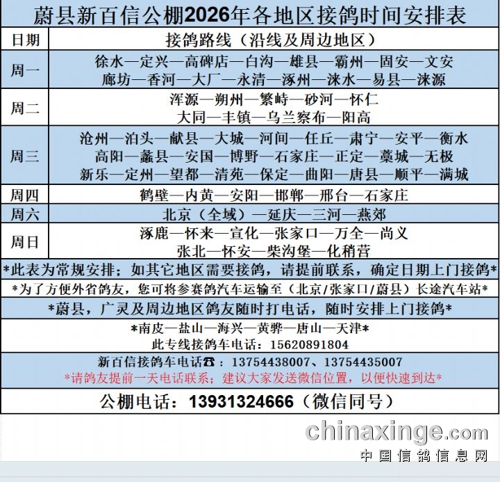 蔚县新百信公棚2026年各地区接鸽时间安排表