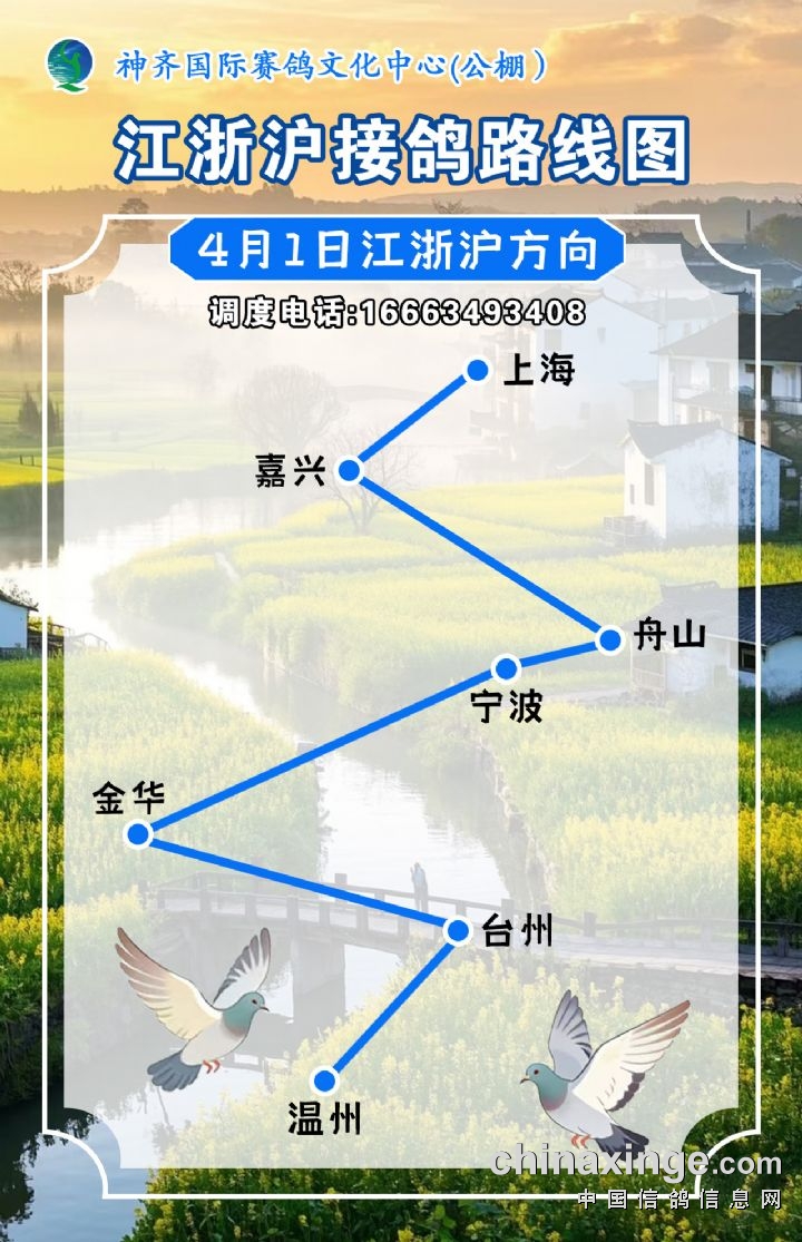 神齐国际赛鸽文化中心(公棚)4月1日江、浙、沪接鸽路线