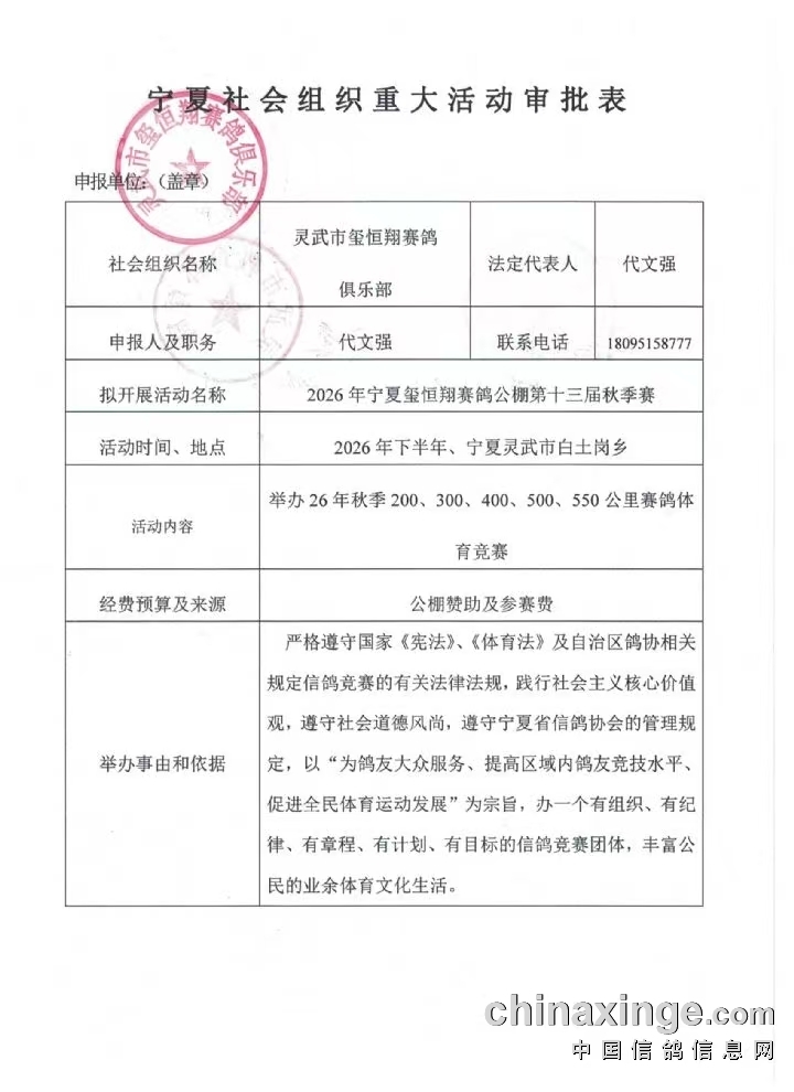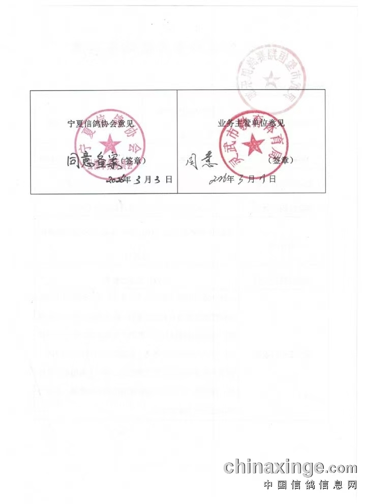 宁夏玺恒翔公棚2026年秋季赛鸽体育竞赛备案表