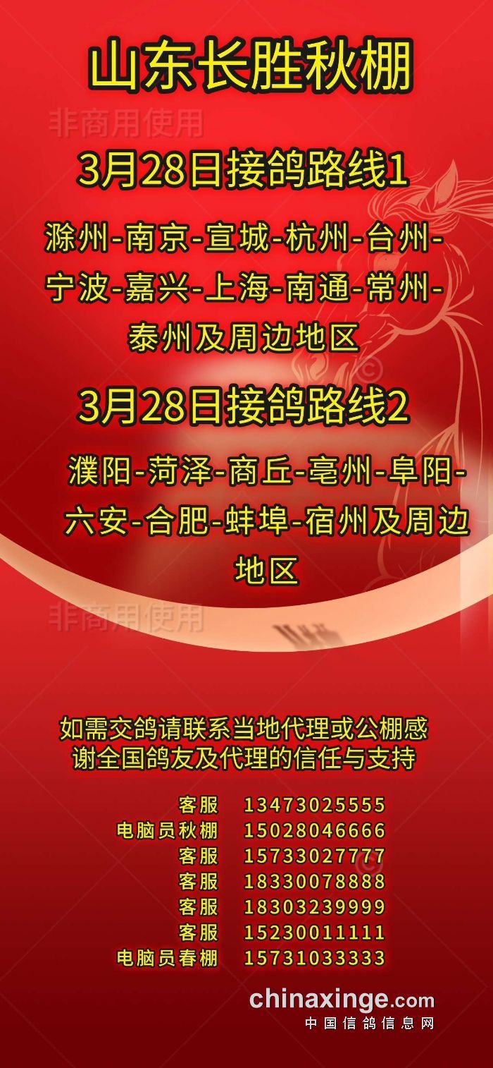 山东长胜秋棚3月28日接鸽路线