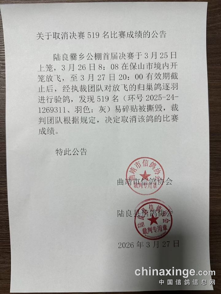 2026年爨乡公棚: 关于取消决赛519名比赛成绩的公告
