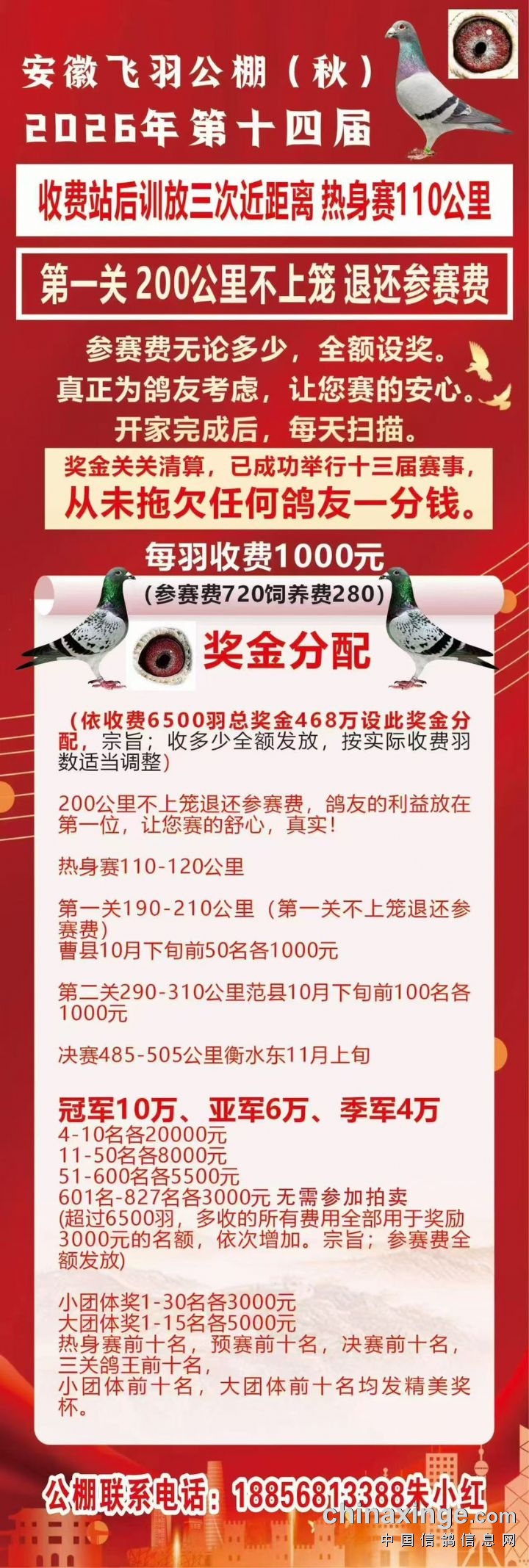 安徽飞羽公棚(秋):2026第十四届第一关200公里不上笼退还参赛费