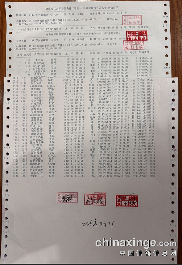 春兴国际(春棚)第一关比赛集鸽清单裁判盖章