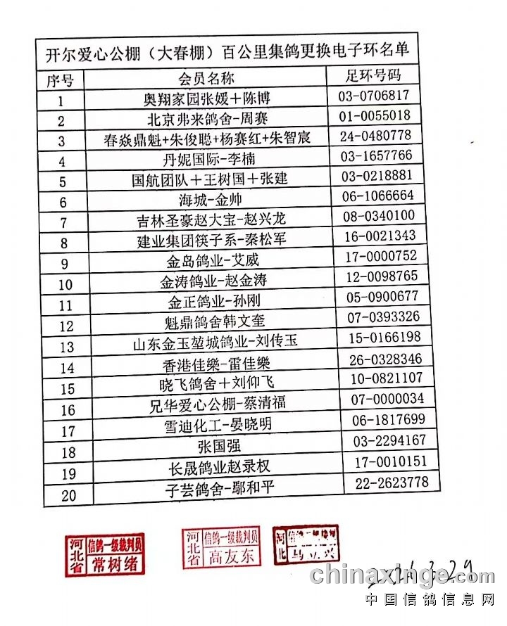 开尔爱心公棚(大春棚)百公里集鸽更换电子环名单