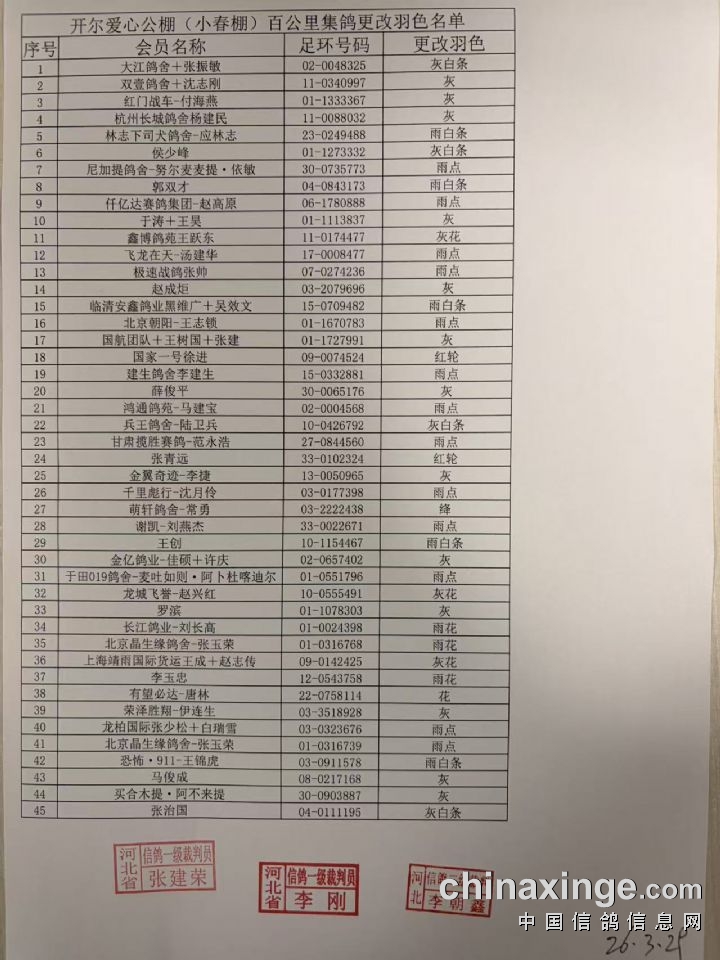 开尔爱心公棚(小春棚)百公里集鸽更改羽色名单