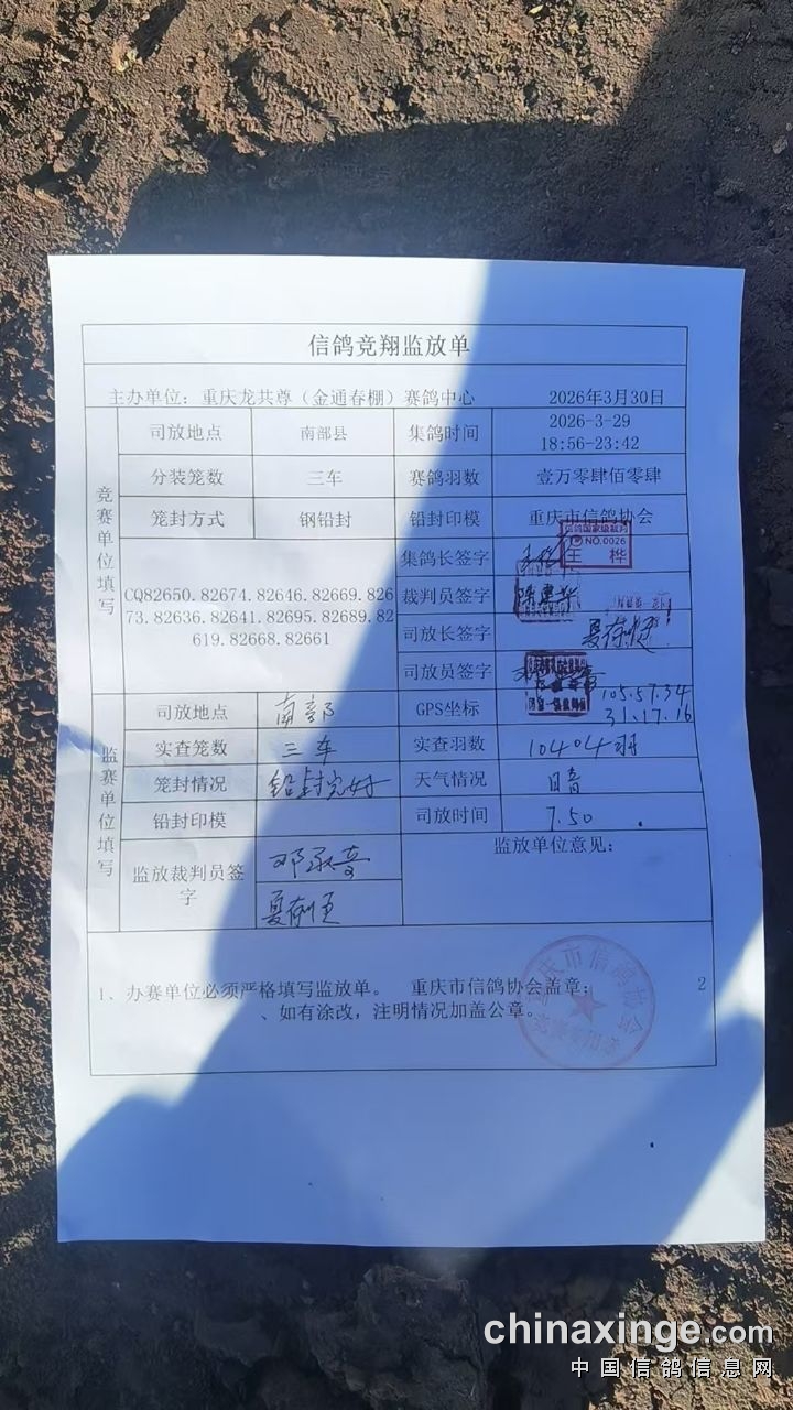 尊敬的鸽友:重庆龙共尊(金通春棚)第七届第一关于7:50在南部县开笼,司放地经纬度:经度105.57.34 纬度31.17.16。实测空距115空距。预祝各位会员取得优异成绩!短信由第三方平台提供,有约3%的随机漏发概率,请大家以网站上的实时在线扫描数据为准!