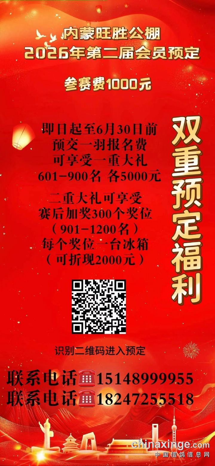 感恩相伴,风雨同行,每一份选择,皆因认可!2026年内蒙旺胜公棚会员预定正在进行中!请您在中信网提交您的预定信息(参赛名、手机号,真实姓名、地区等),工作人员审核后您即可查询您的预订信息。如有修改或变动请您及时与公棚取得联系:15148999955,18247255518(微信同号)