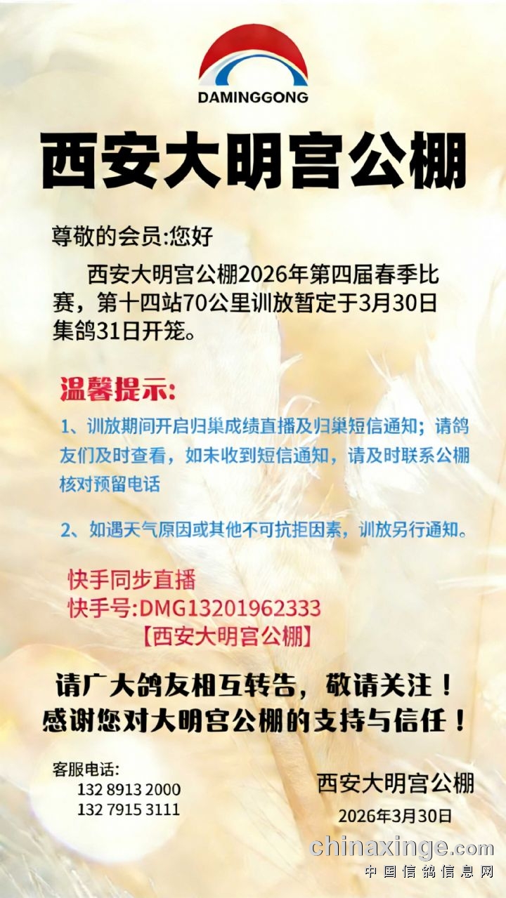 训放期间开启归巢成绩直播及归巢短信通知;请鸽友们及时查看,如未收到短信通知,请及时联系公棚核对预留电话。