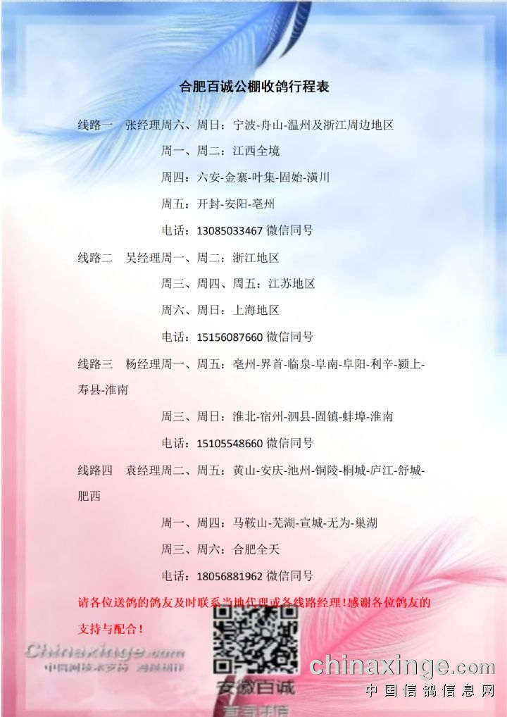 安徽百诚赛鸽中心:一周接鸽行程安排(3月30日-4月5日)
