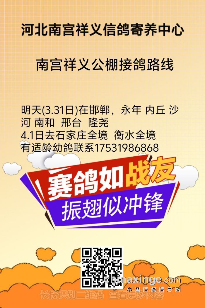 祥义公棚,接鸽路线 3.1日明天在邯郸全境 邢台全境 ?4.1日衡水全境 石家庄全境 ?有适龄幼
