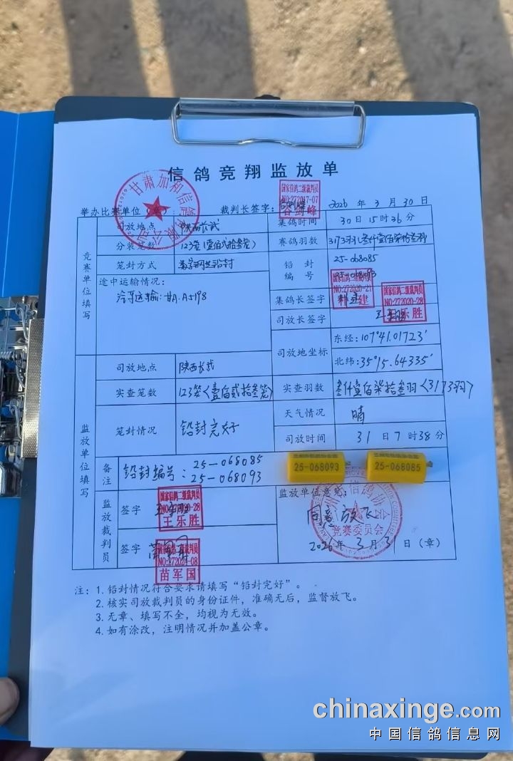 甘肃加和赛鸽公棚第二关长武站于2026年3月31日,共计集鸽3173羽,经汽车拉运至长武(东经107度41.01723分 北纬35度15.64335分)经兰州市信鸽协会裁判组检查,各车铅封完好,于当地时间7:38分同时开笼,预祝参赛鸽友取得好成绩。