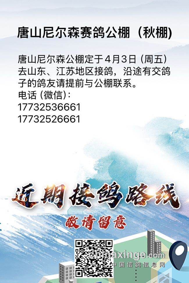 唐山尼尔森公棚4月3日(周五)山东、江苏地区接鸽通知