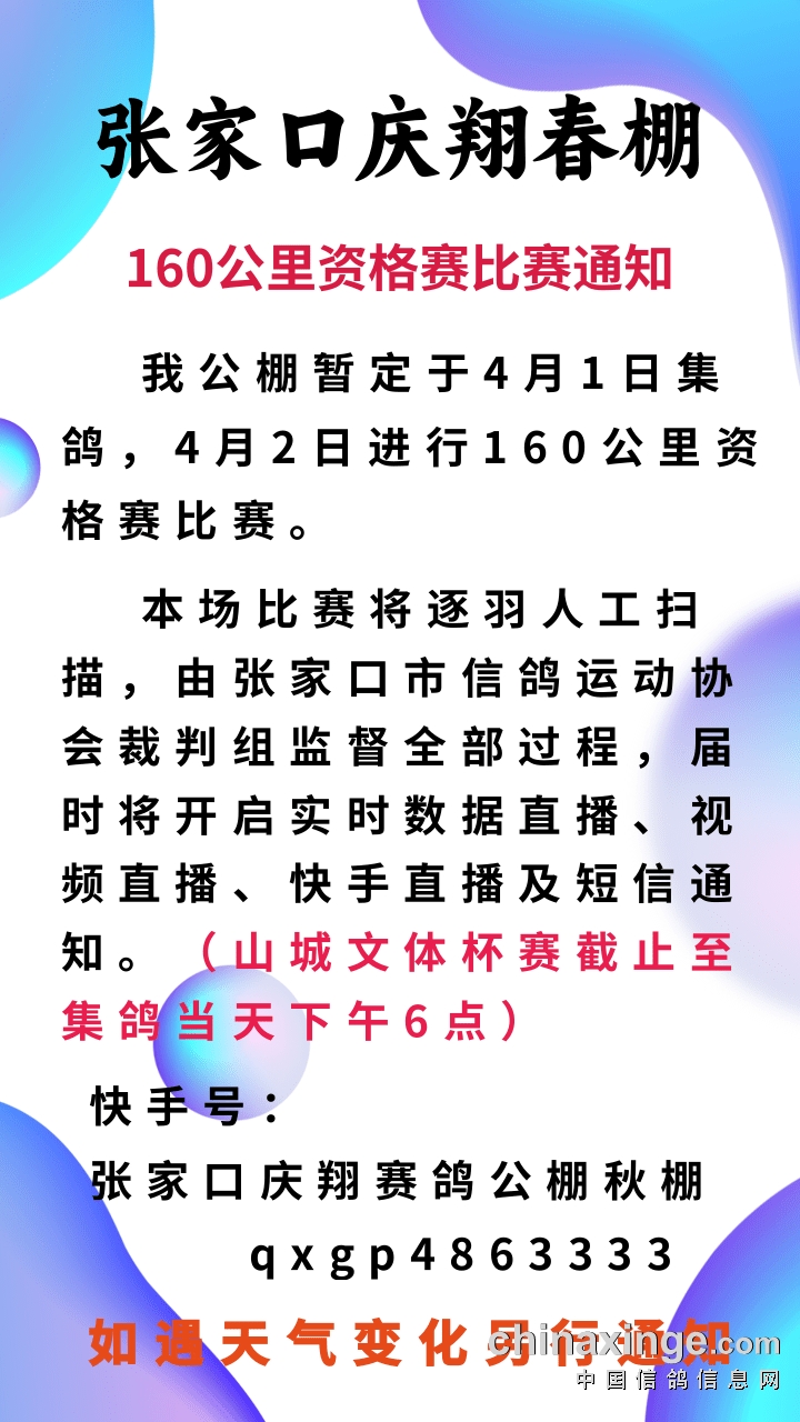 张家口庆翔春棚100公里清棚更改羽色名单