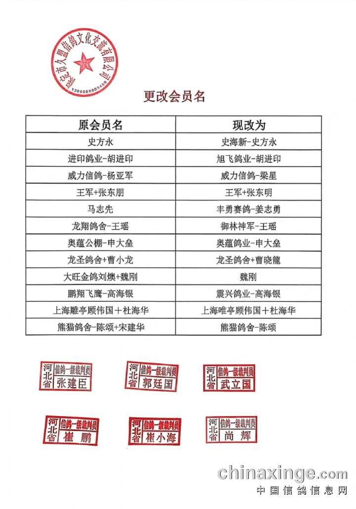河北久盟国际赛鸽公棚(春棚)收费站更改会员名