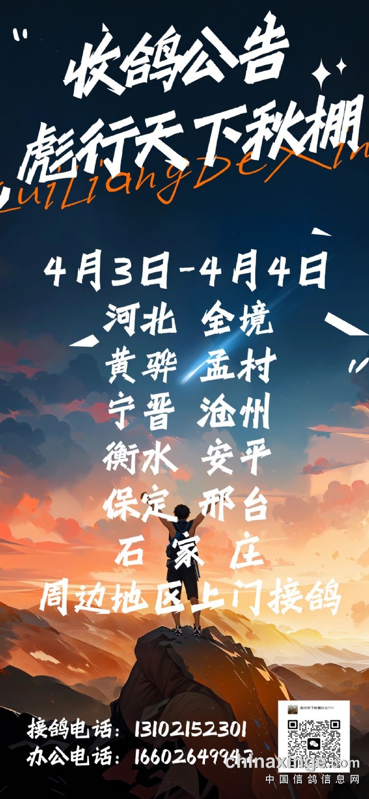 天津彪行天下赛鸽秋棚4月3日-4月4日前往河北全境、 黄骅、孟村、宁晋、沧州、衡水、安平、保定、邢台、石家庄及周边地区上门接鸽。