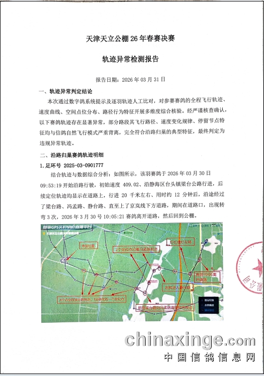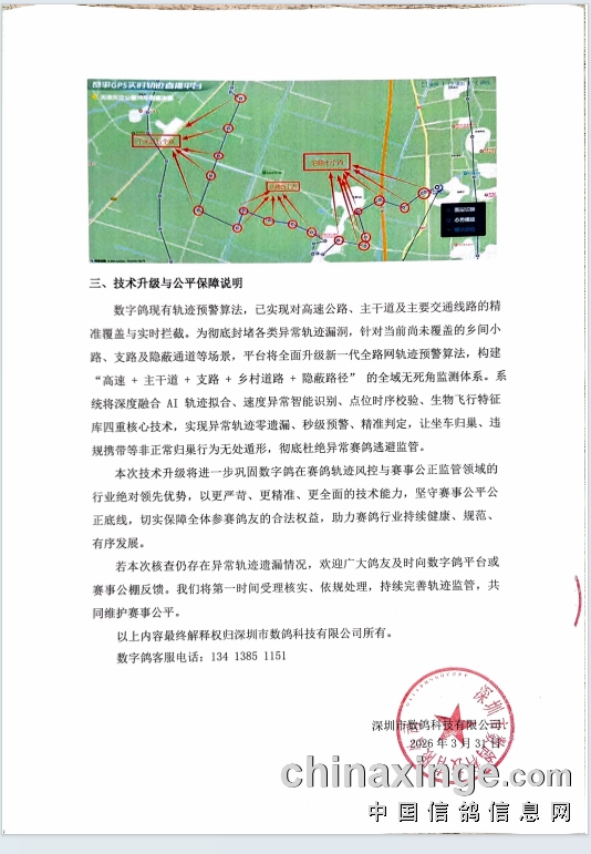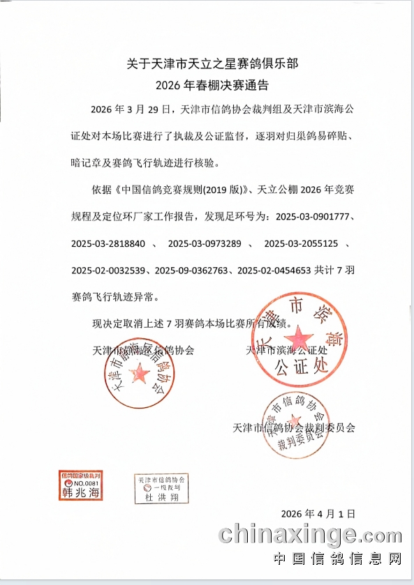 本场赛事归巢鸽经天津市信鸽协会、天津市滨海公证处及深圳市数鸽科技有限公司共同核实校验,发现有非正常归巢轨迹的赛鸽,现已决定取消其成绩,名次顺延(顺延的赛鸽必须是在成绩取奖有效报道期内)。
