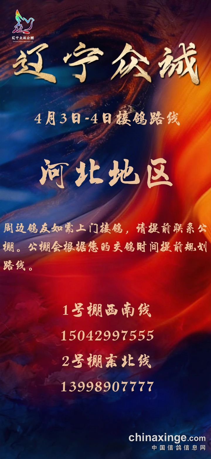 辽宁众诚赛鸽公棚4月3日-4日河北地区接鸽公告