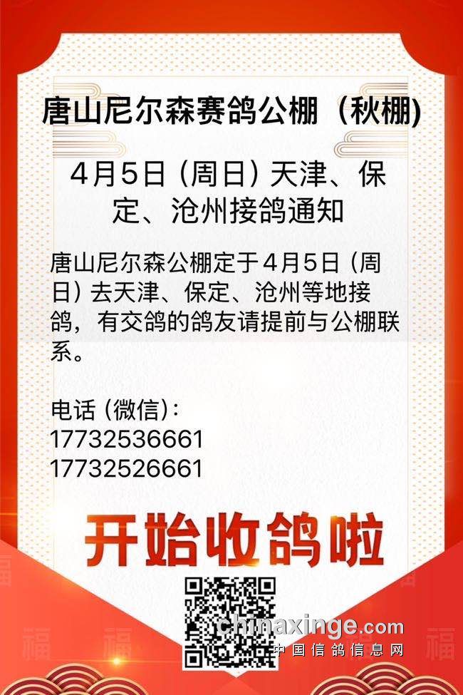 唐山尼尔森公棚4月5日(周日)天津保定沧州接鸽通知