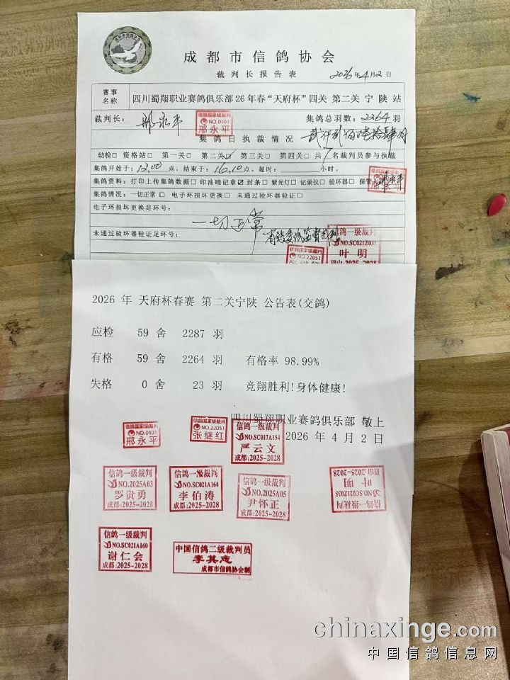 四川蜀翔职业赛鸽俱乐部2026年春季职业赛第二关宁陕站集鸽工作在省鸽协和成都市信鸽协会执裁裁判的认真执裁下,经全体参赛团队(鸽友)积极参与和支持,已于2026年4月2日16点10分结束。总集鸽羽数2264羽。现将集鸽执裁报告及相关数据公示如下(所有集鸽原始单据、存根由执裁裁判保管,待比赛结束验鸽时开启核对):
