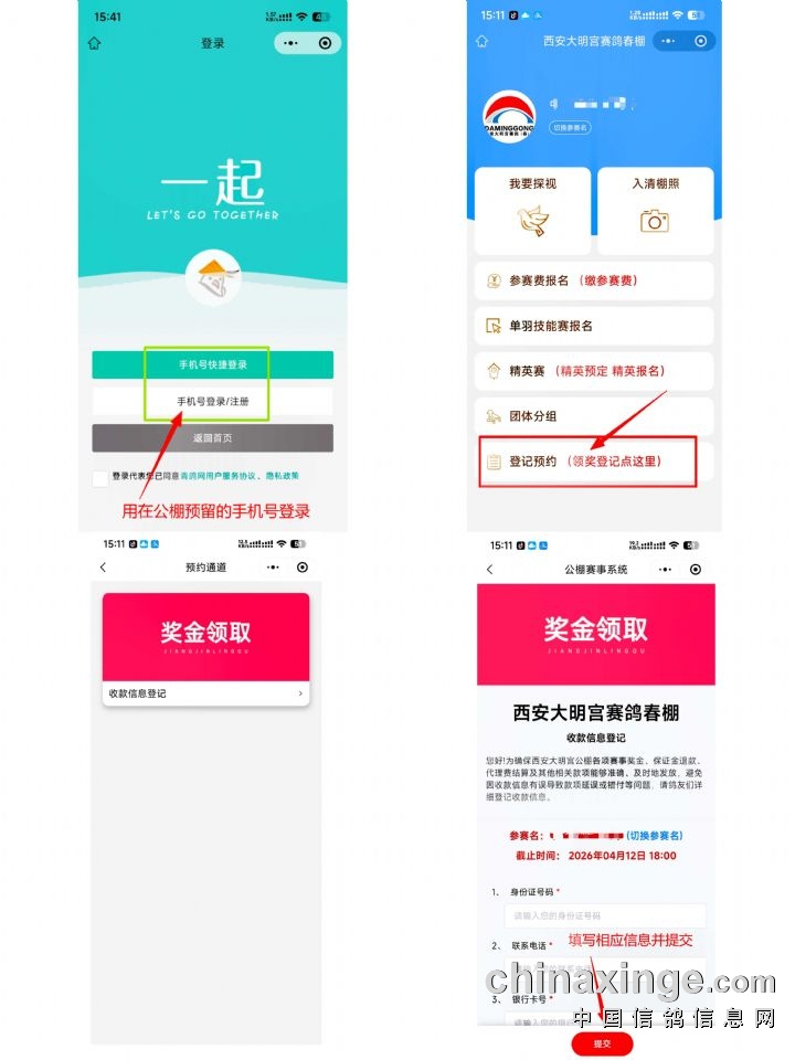 您好!为确保西安大明宫公棚各项赛事奖金、查棚注册无存棚鸽预交保证金会员的保证金退款及其他相关款项能够准确、及时地发放,避免因收款信息有误导致款项延误或错付等问题,现开始参赛会员收款信息登记工作。