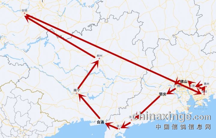 从贵阳出发,途经深圳、惠州、东莞、佛山、广州、肇庆、茂名、湛江、合浦、南宁、柳州,最后到达安顺市西秀赛鸽中心。