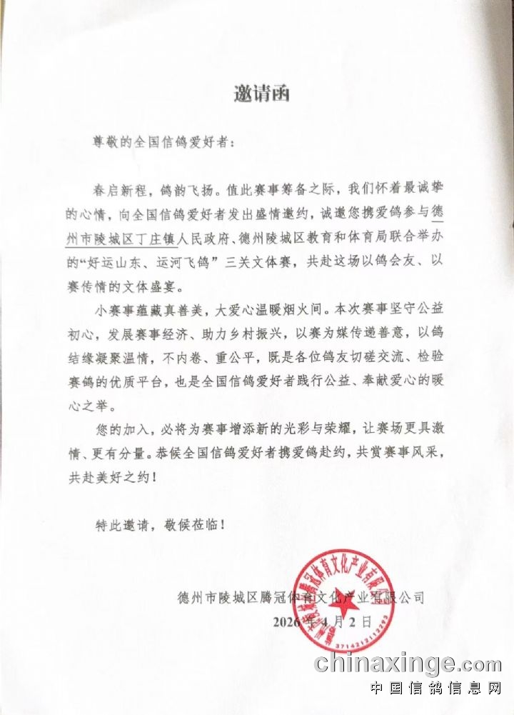 关于举办“好运山东”“运河飞鸽”2026年陵城区全国信鸽大赛的邀请函