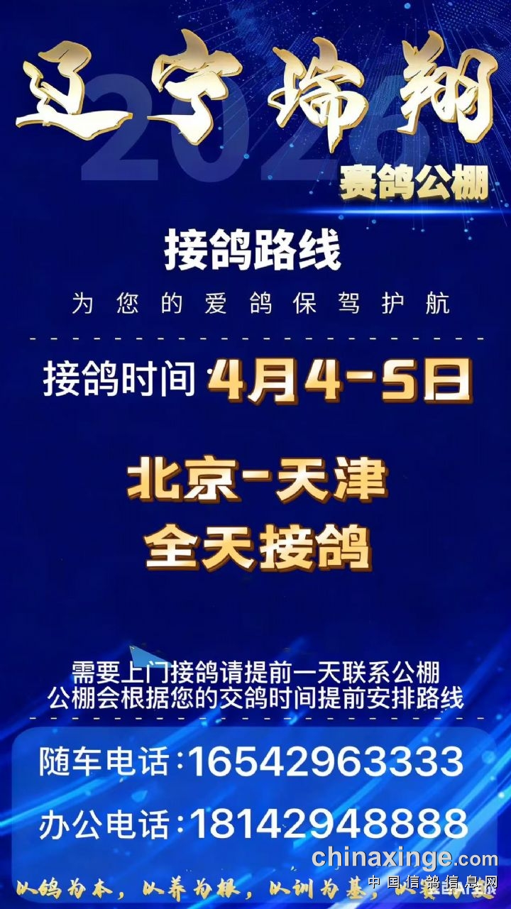 辽宁瑞翔赛鸽公棚4月4-5日北京、天津全天接鸽公告