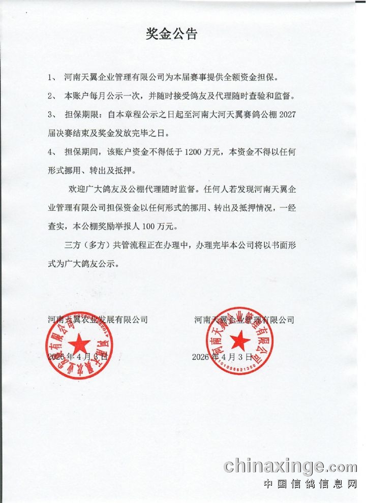 回想公棚成立之初,我们曾立下誓言:让奖金先于赛鸽“入棚”,让安全走在风险前面。 为此,我们不惜资金代价,将全额赛事奖金存入三方共管账户,并由河南天翼企业管理有限公司提供全额担保。我们深知,鸽友送来的每一羽赛鸽,背后都是数年的心血与全家的期盼。若不能为这份期盼提供一个绝对安全的港湾,再宏伟的赛事蓝图也只是空中楼阁。