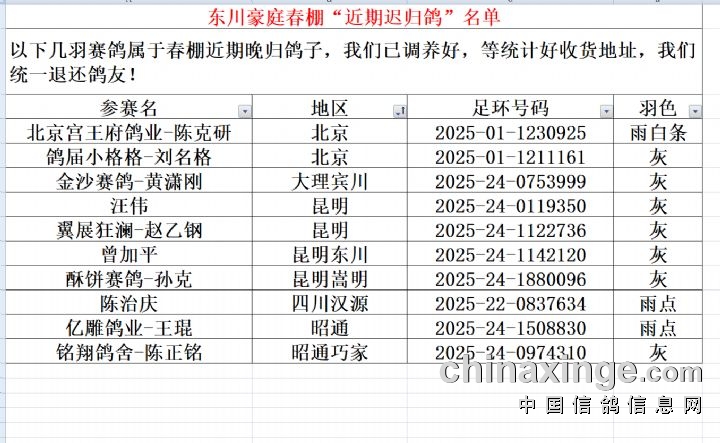 东川豪庭春棚“预赛”训放归巢成绩汇总(不排除漏扫)