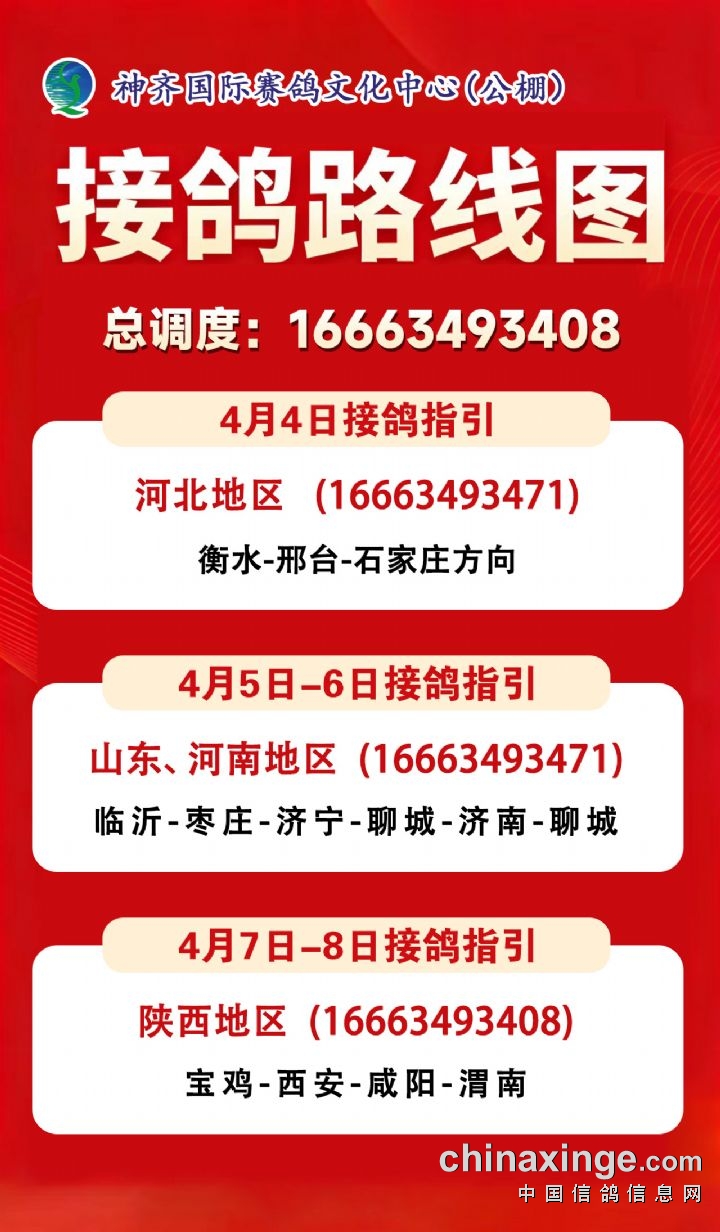 神齐国际赛鸽文化中心(公棚)4月4日-8日河北、山东、河南、陕西方向接鸽路线