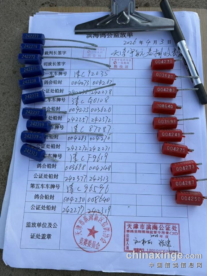 天津宇航春棚90-100公里训放将进行人工逐羽扫描集鸽上笼.并由天津市滨海新区信鸽协会裁判组以及天津市滨海公正处亲临现场监管宇航春棚.集鸽.铅封.运输.开笼放飞全过程