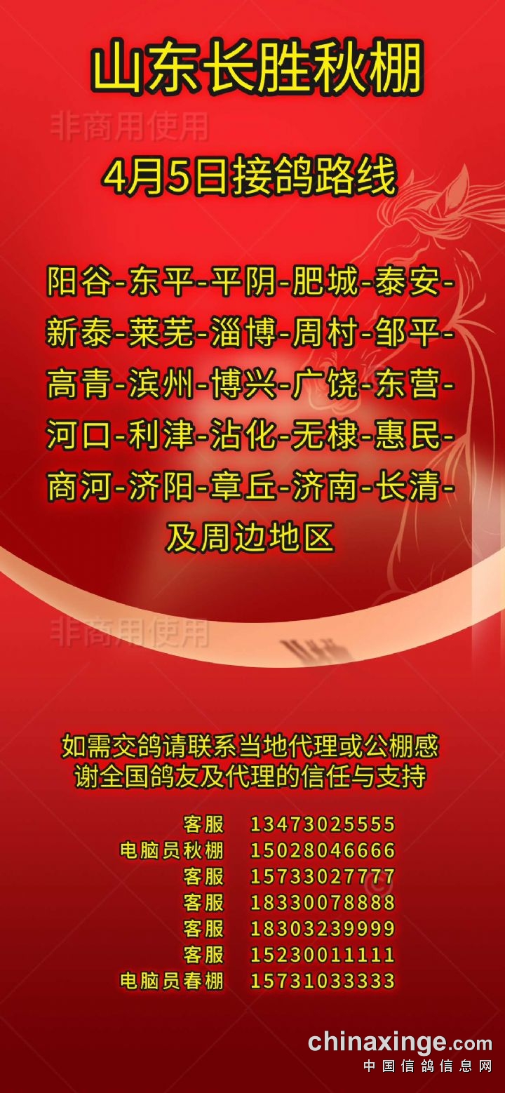 山东长胜秋棚4月5日接鸽路线