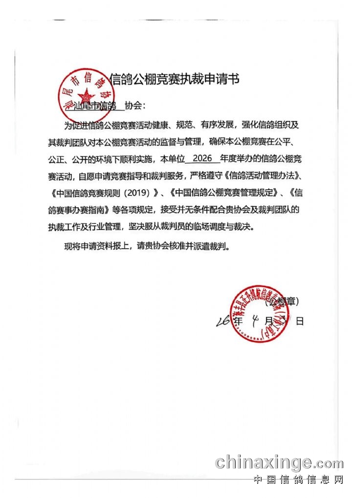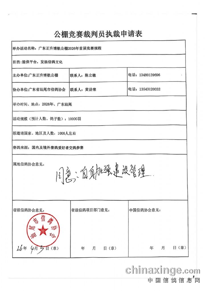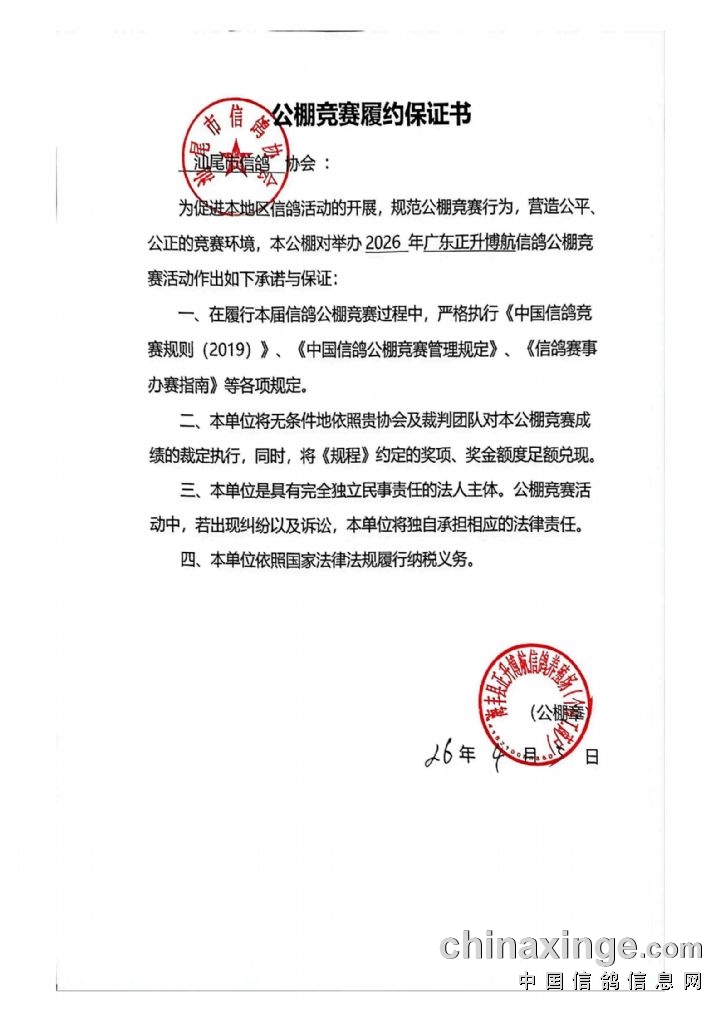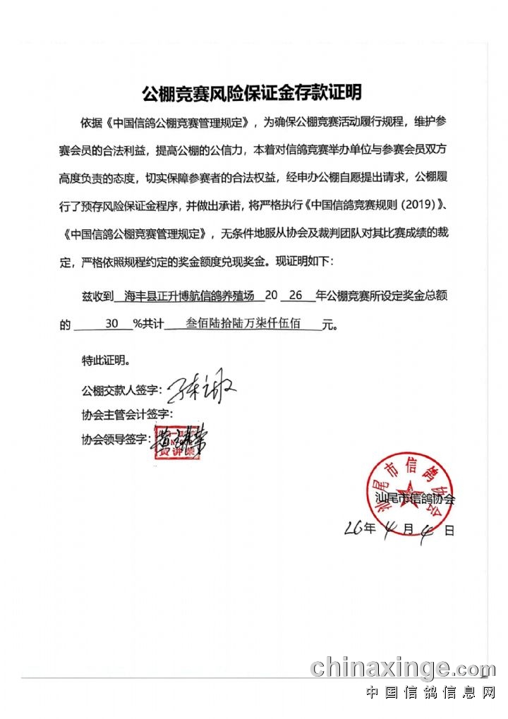 为维护参赛会员合法权益,提升公棚公信力,本着对赛事举办方与参赛会员高度负责的原则,切实保障广大会员切身利益,正升博航公棚严格依照《中国信鸽公棚竞赛管理规定》,完成预存风险保证金流程。