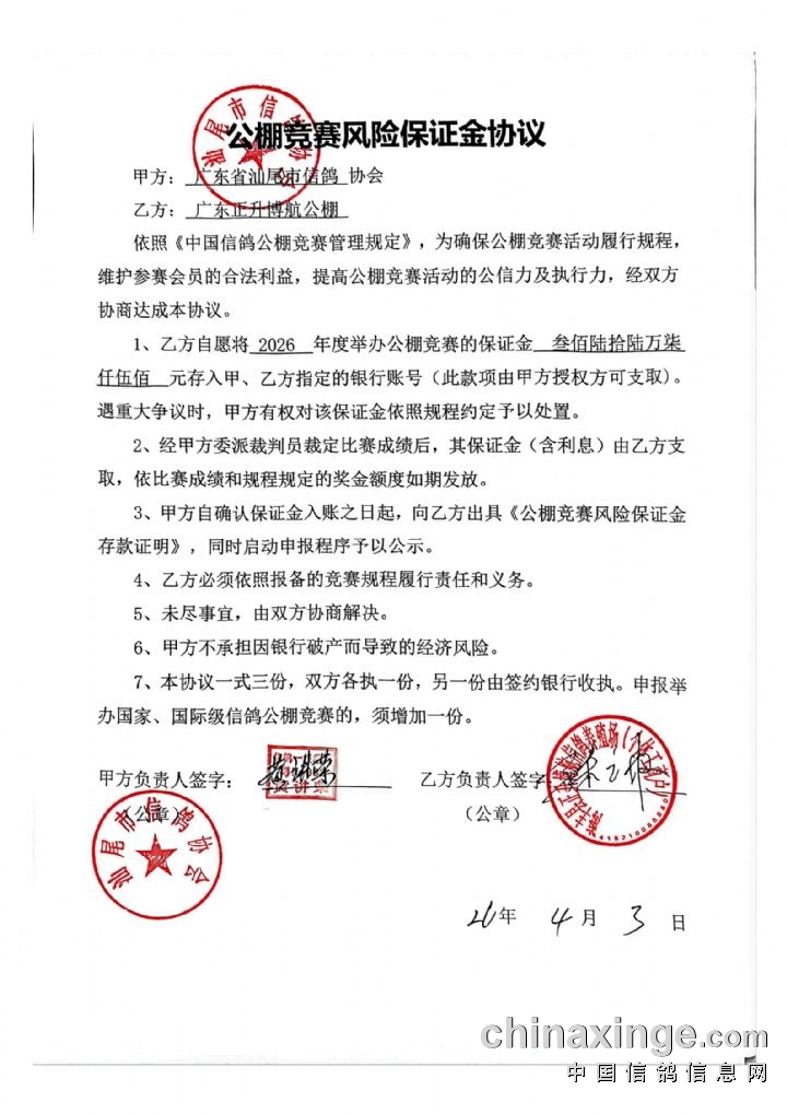 已将 2026 年度公棚竞赛保证金共计叁佰陆拾陆万柒仟伍佰元整(为总奖金的 30%),存入汕尾市信鸽协会指定银行监管账户,该款项需在汕尾市鸽协授权后方可支取,奖金保障有监管。