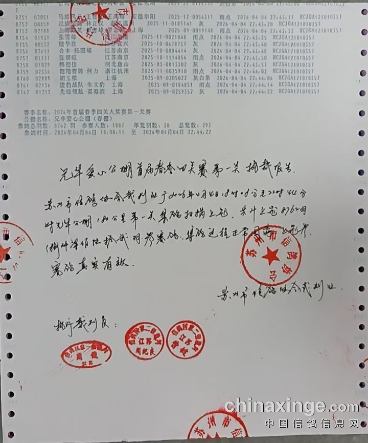 兄华爱心公棚(春棚):第一关集鸽清单裁判盖章